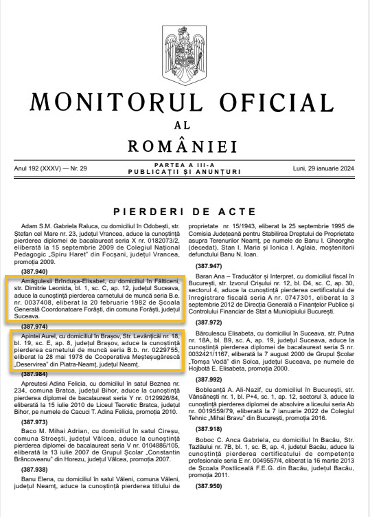 - O copie a cărții/buletinului de identitate (CI/BI) al titularului documentului pierdut