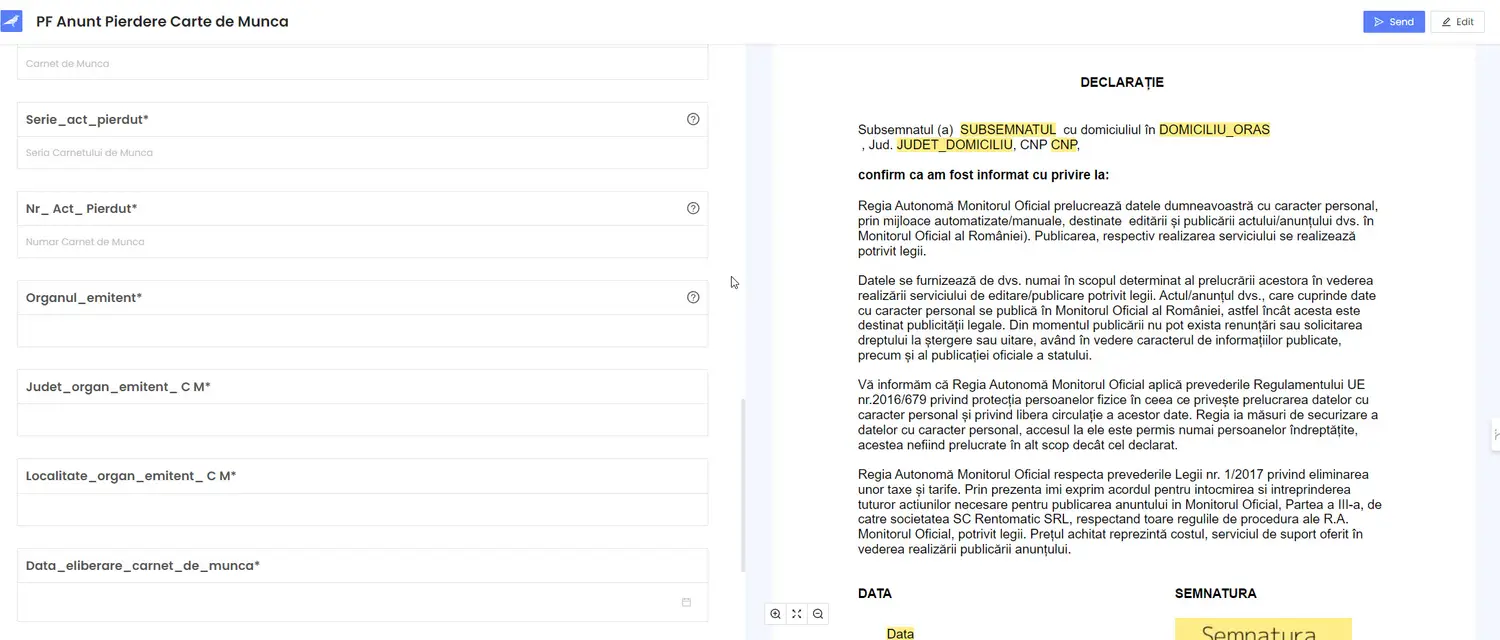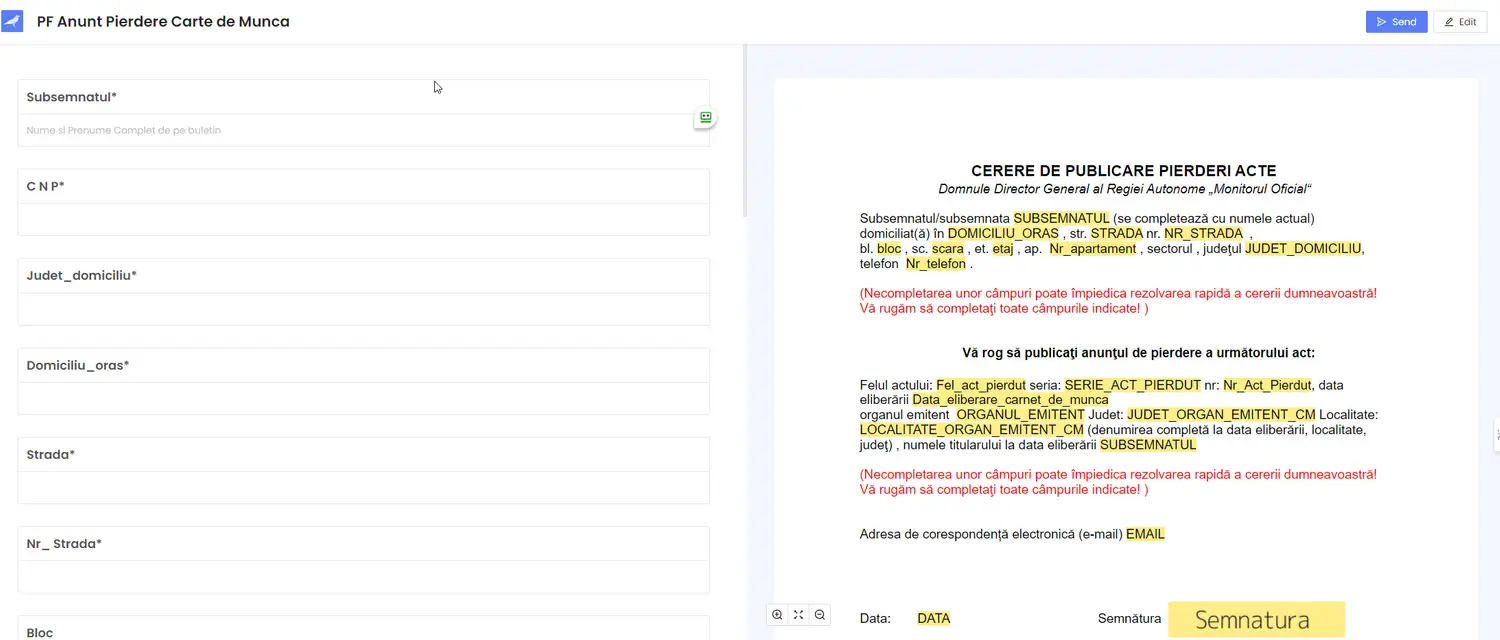 În partea stânga, aveți formularul ce trebuie completat, casuță cu casuță și cererea din dreapta se auto completează cu datele introduse de dvs. La sfârșit semnați online și ne trimiteți documentul.